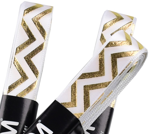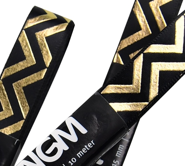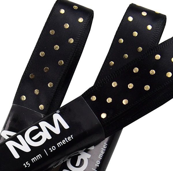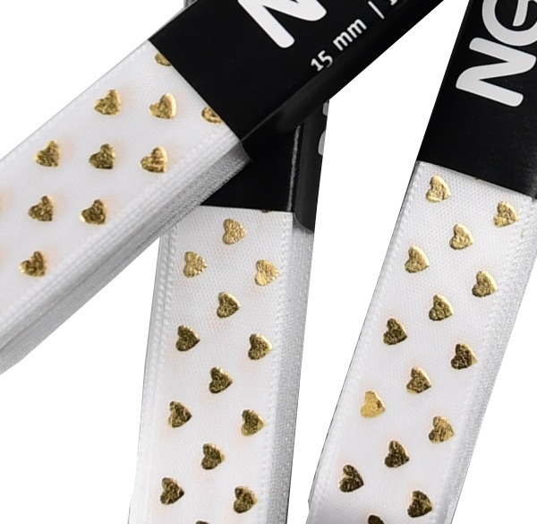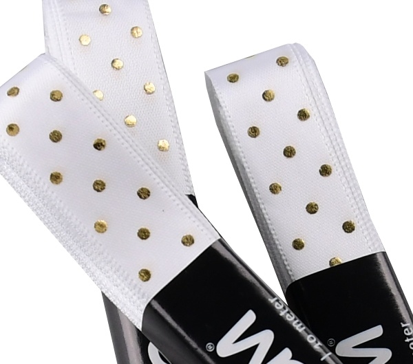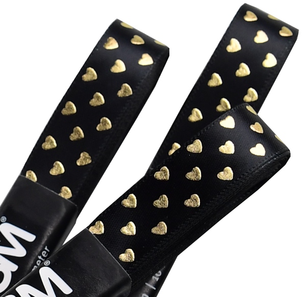 Stuha ATLASOVÁ GOLD. Stuha je jednolící se zlatým potiskem puntík, srdce, cikcak je vhodná k dekoračním účelům.